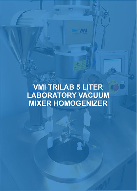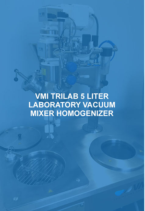 The VMI Trilab is our versatile lab & pilot scale Vacuum Mixer Homogenizer series that covers batch ranges of 5, 10, 30, and 50 liters working capacity. The Trilab combines inner and outer counter-rotating co-axial agitators, with our efficient bottom-entering Rotor & Stator high shear mixer. The Trilab systems are vacuum capable and jacketed for heating or cooling, and include an agitated Melting Vessel.